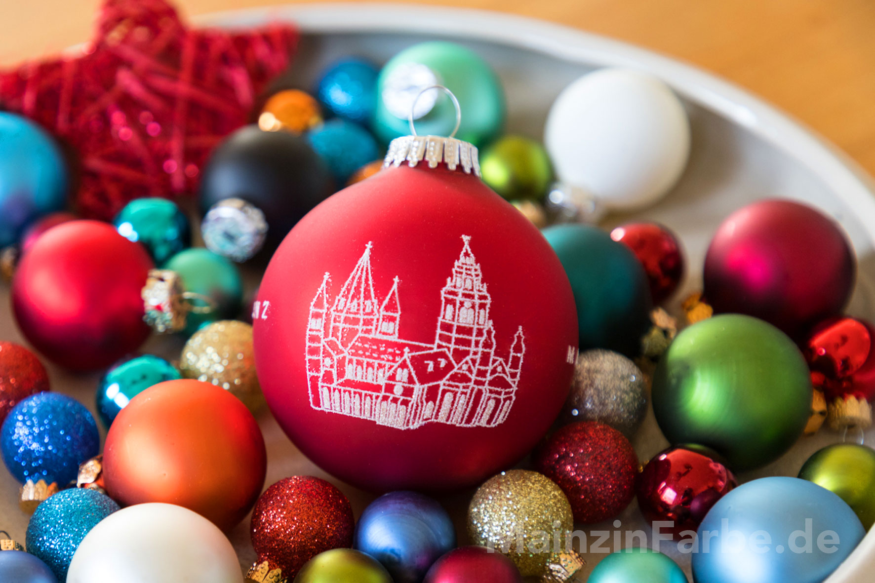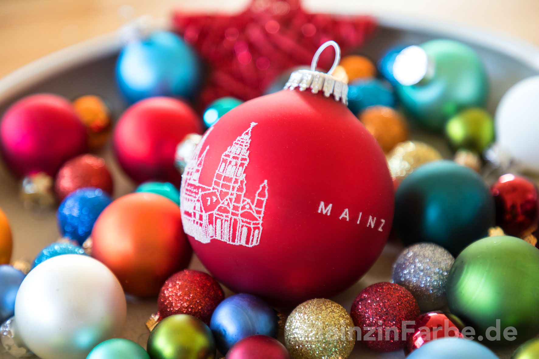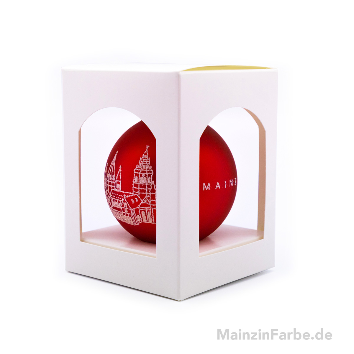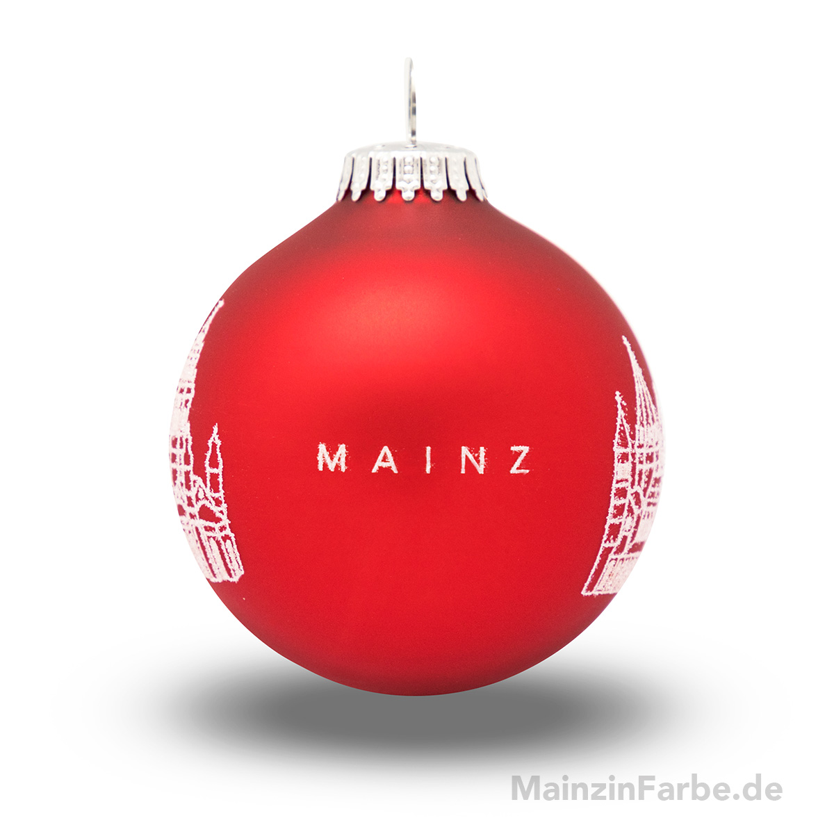 Die Christbaumkugel ist ringsum bedruckt mit glitzernden Linien. Zu sehen sind auf Vorder- und Rückseite der Mainzer Dom (gegenüberliegend), sowie der Schriftzug MAINZ (gegenüberliegend).